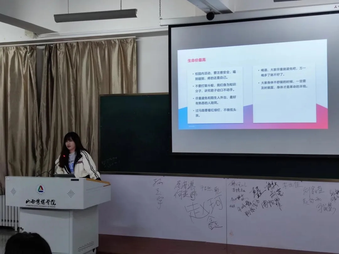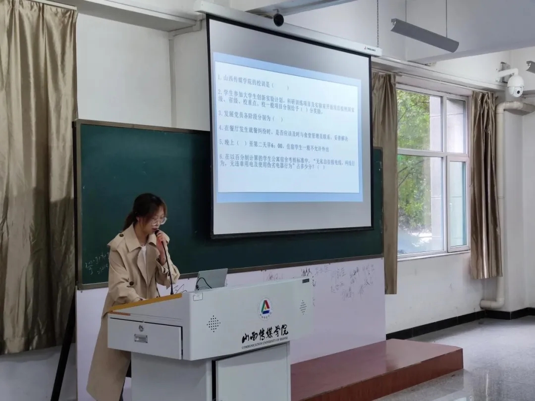 班会的第一项内容,由20级网新二班杨一帆同学介绍我校的历史沿革与发展情况,充分展示我校近年来所获的荣誉称号,让同学们了解到“厚德博识,励学躬行”八字校训是每一位山传学子在探求知识的征途中自强不息、砥砺前行的风向标。同时也介绍了我校“质量立校、科研强校、特色兴校”的发展战略,围绕我校“传媒为根、铮魂为本、理实并重、守正创新”的办学特色展开介绍我校的治学方针。
